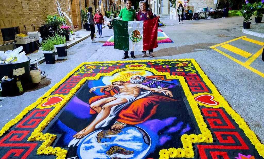 Una delegación de alfombristas de Huamantla participó en la vigésimo segunda edición del Corpus Domini en la ciudad de Montefiore dell’Aso, en Italia, con la elaboración de una colorida alfombra de tierras, con materiales y técnicas tradicionales del arte efímero de este pueblo mágico, Patrimonio Cultural Inmaterial de México.